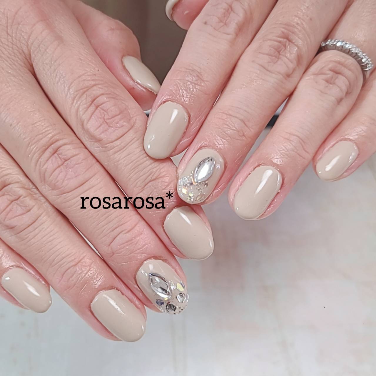 ナチュラルベージュのワンカラーです。 イエローベースのお肌なので、ベージュがよくお似合いになります! 大きめのストーンとホロが、存在感があり素敵ですo(^o^)o
