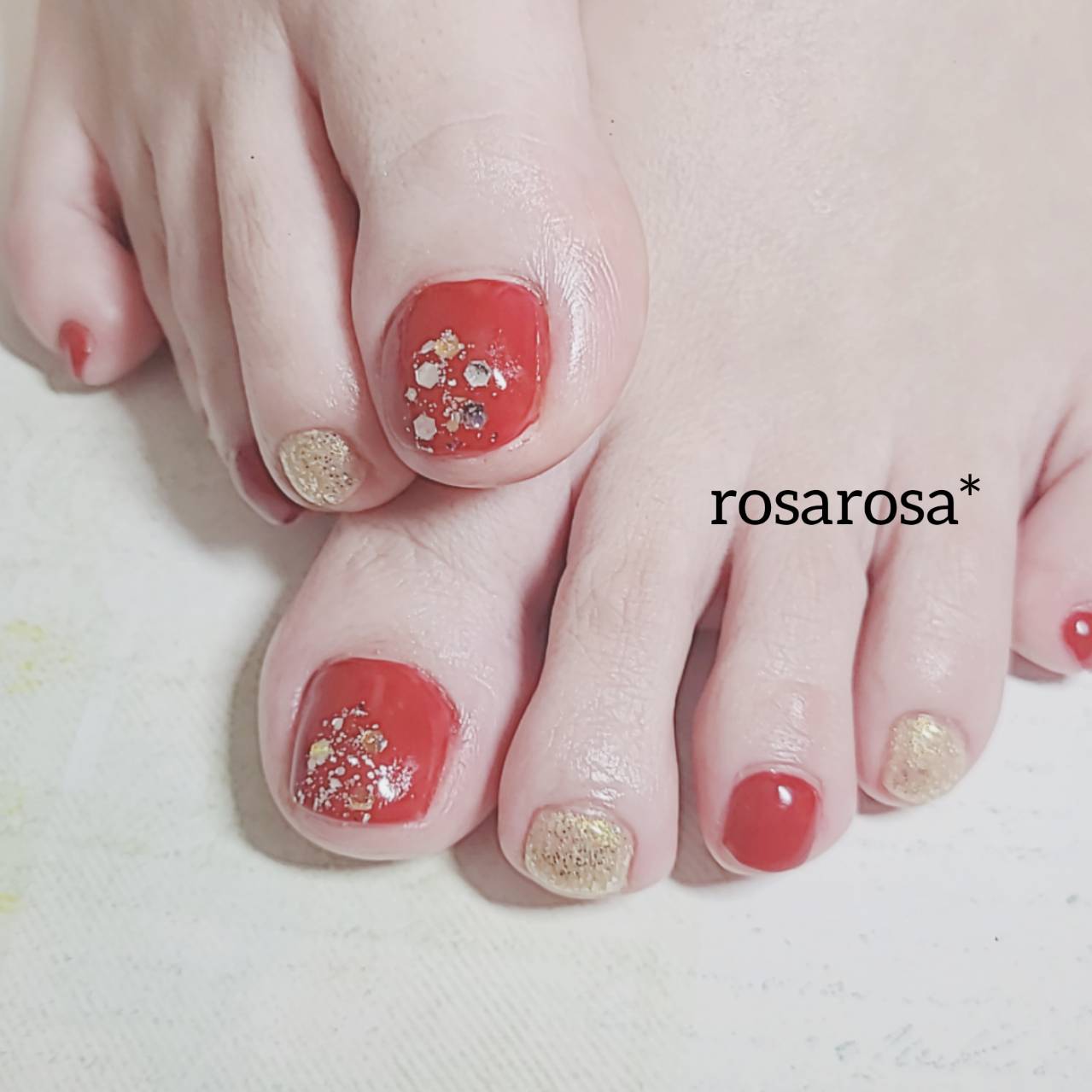 フットネイル 2022.06.19 フットネイルのあるあるですが、赤系か青系にするか、みなさん割りと悩まれます。 どちらも、フットネイルには映えますね。 私は、テンションの上がる方がいいですよ!と、お勧めします。 赤とゴールドの組み合わせ、情熱的で素敵ですo(^o^)o ゴールドは、金運アップの色でもあります。