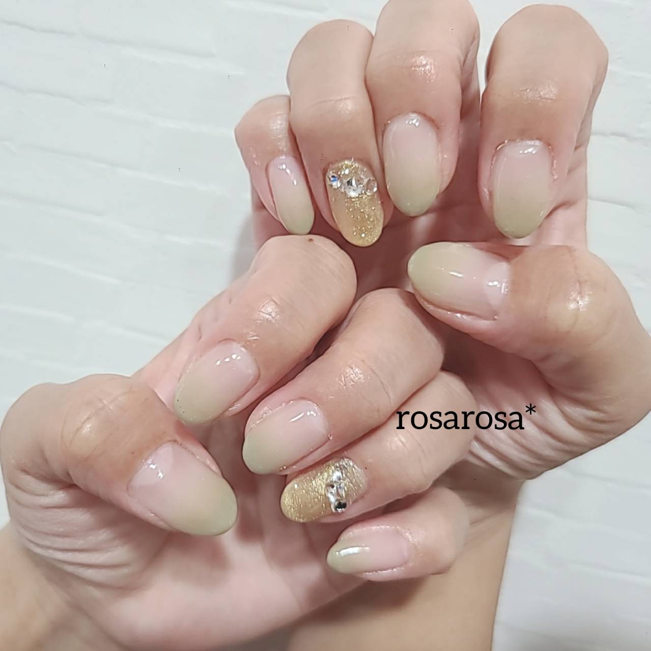 秋ネイル 2021.09.30 9月も終わり、かなり風が涼しくなってきました。 ネイルも秋色を乗せる方が増えています。 カーキのグラデーション。肌馴染みがよくて、お似合いです。 ゴールドのワンカラーに大きめのストーンを乗せて、アクセントに1本ずつ。 お客様の運気UPのカラーだそうです! ネイルを変えると、気分も上がりますねo(^o^)o