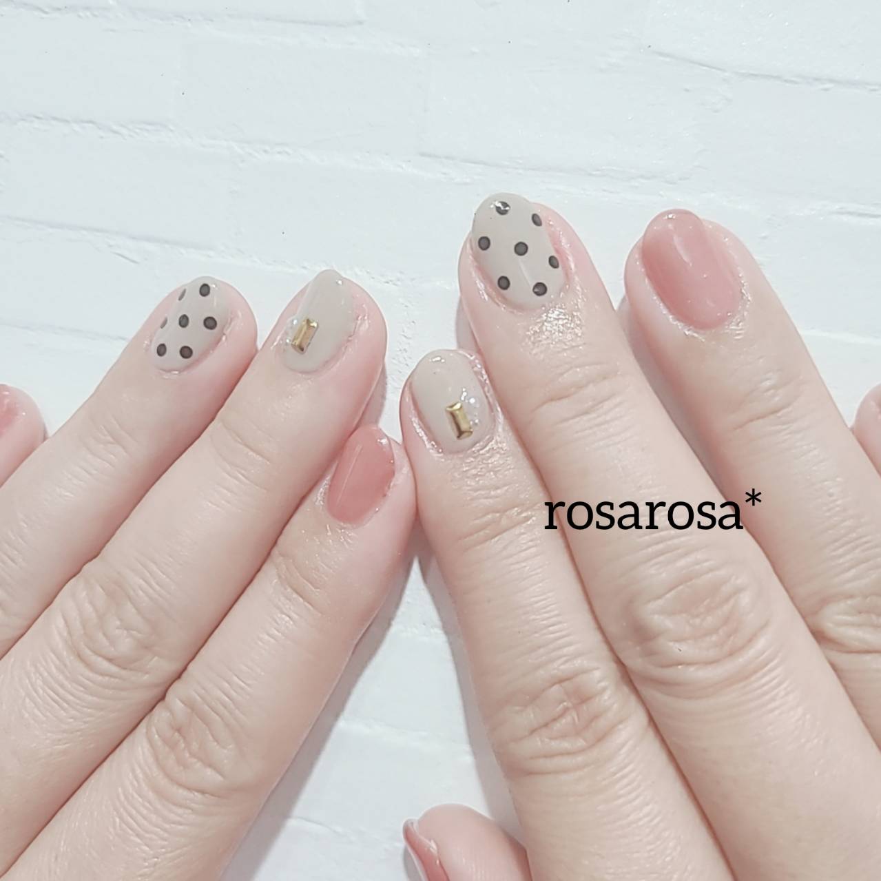 ピンクとベージュのワンカラーの組み合わせは、大人女子って感じです。 さらに、黒のドット柄がキュートさを増してます。 いつもは、原色のワンカラーを乗せることが多いお客様ですが、たまには柔らかいお色もいいですねo(^o^)o
