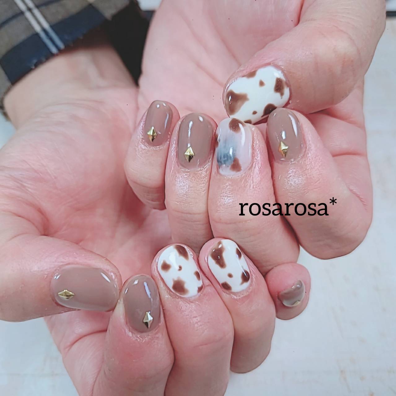 牛柄 2021.11.3 茶色の牛柄、茶色のワンカラーで秋色ネイル完成です! お爪が内出血してしまっているところがあったので、そこを誤魔化すために牛柄をご希望されました。 ナイスアイデアですね! お爪の様子が分かるように、薄めの白を乗せてあります。 久しぶりのネイルにテンションUPしてくれて、嬉しかったですo(^o^)o 気になることがあったら、お気軽にご相談くださいね。