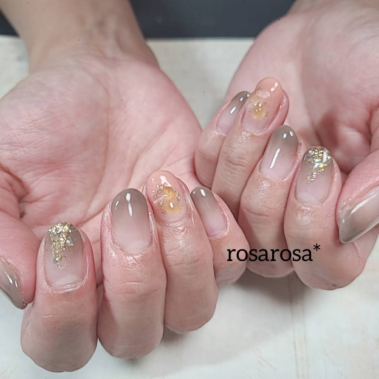 ブラウンのグラデーション 2021.11.4 先日の牛柄のお客様のワンカラーと同じブラウンです。 ワンカラーとグラデーションでも、印象が変わります。 グラデーションのいいところは、伸びてもあんまり気にならない! さらに、ゴールドのホロをいれて、運気UP! 立体感のあるストーンを乗せました。 秋色で、まとまり素敵ですd=(^o^)=b