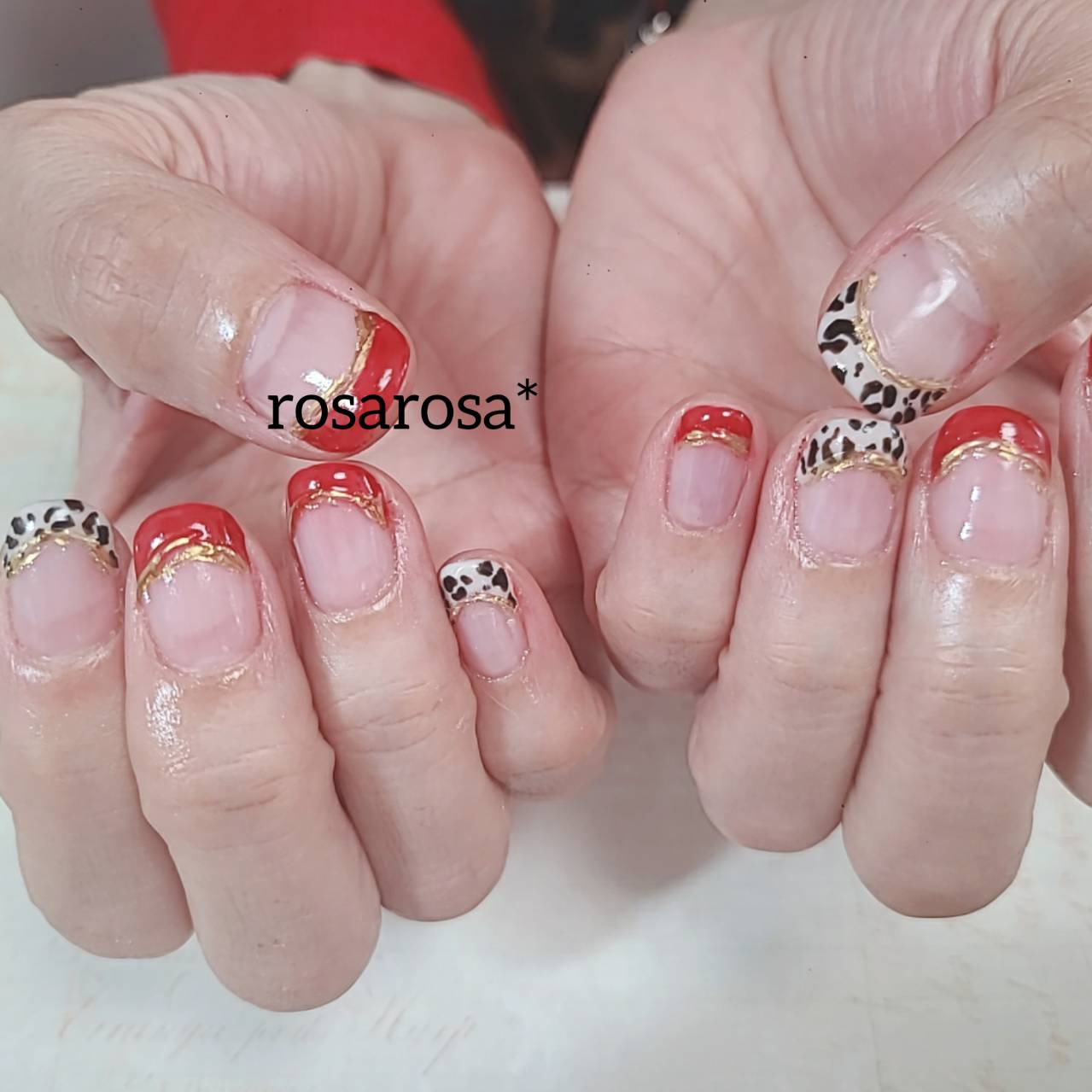 フレンチ 2021.11.25 パーティー出席のためのネイル。ドレスコードが赤か黒だったので、赤を選びました。 レオパードとの相性がバッチリです。 アクセントには、ゴールドのミラーを入れました。 豪華になりましたo(^o^)o
