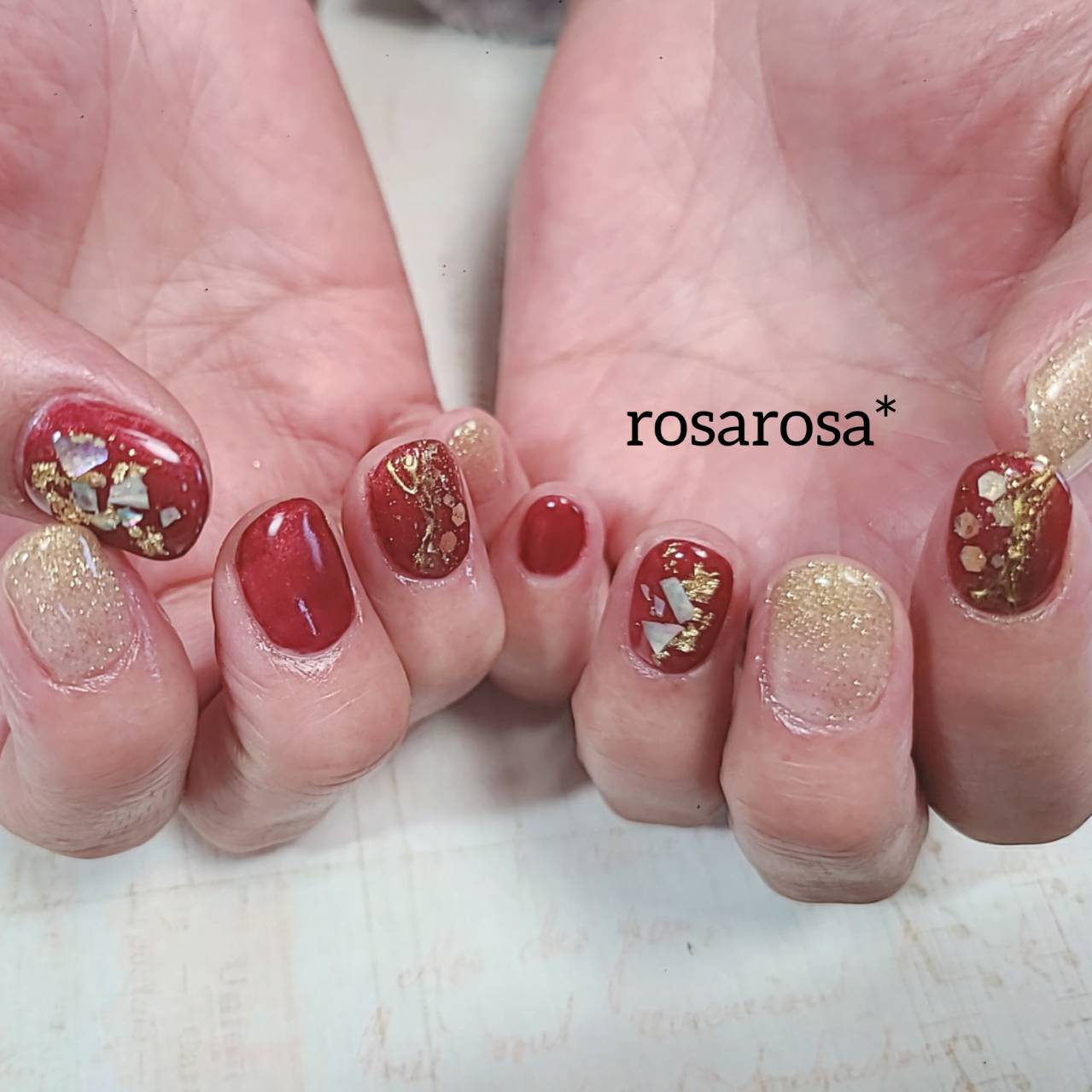 赤のワンカラー 2021.12.17 深みのある赤のワンカラーとゴールドで、年末年始向けに華やかネイルにしました。 シェルとホロを使って、キラキラゴージャス感を出しました。 鮮やかなお色がお似合いです!