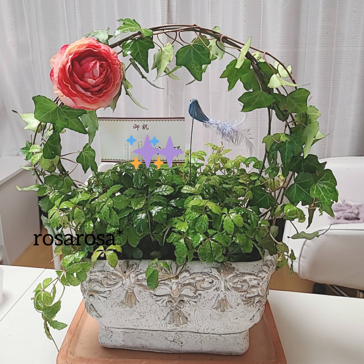 すると、親友からのサプライズが置いてありました。 rosarosa*のロゴマークに、寄せた鉢です。 シュガーパインの蔦を円状につたわせたかったらしく、どーやら育てていたらしい。