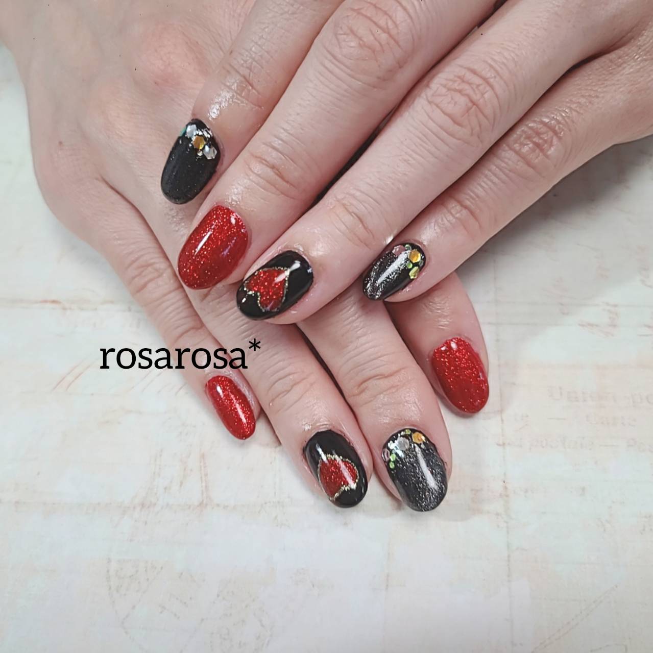 ドレスに合わせて 2022.01.8 パーティー用のネイルです。 黒とラメ入りの赤のワンカラーです。 とにかく、格好いいです! 黒には、マグネットを乗せました。 映えますね。 薬指には、ゴールドのハートで可愛さもプラスです。 楽しんできてくださいね。