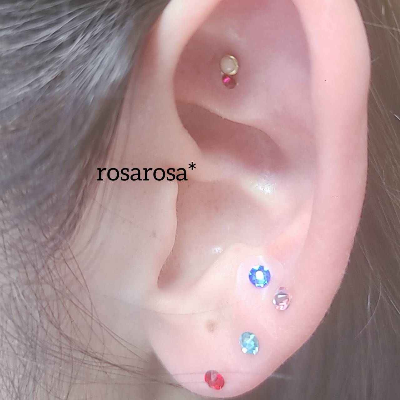 歳を重ねるときになってくるたるみ…リフトアップに有効な耳たぶにストーンを並べてあります。