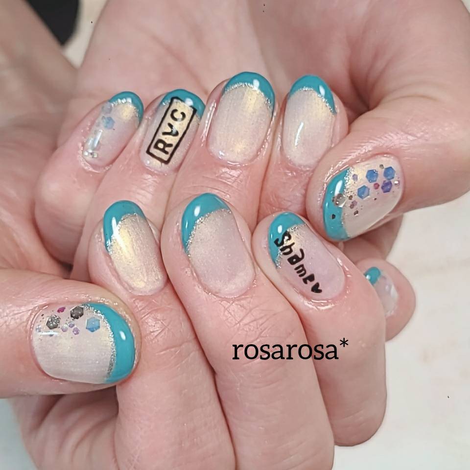 パール感のあるホワイトに、ターコイズグリーンのフレンチです。