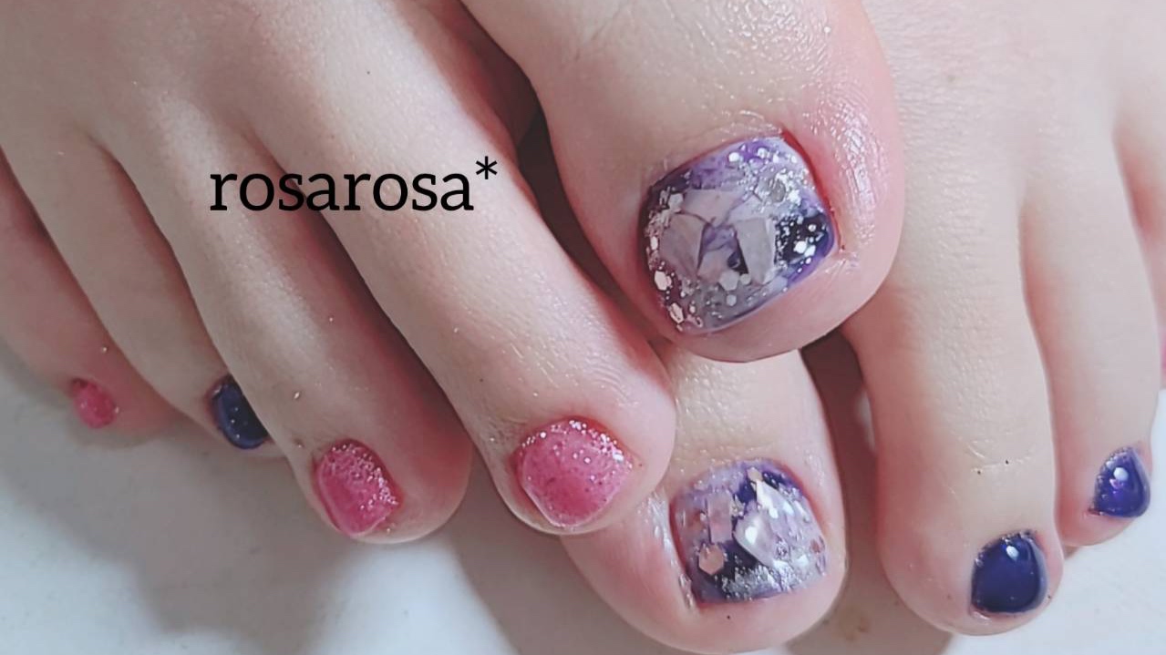 フットネイル 2022.04.16 左右別々の色で、ワンカラーを塗って遊び心を出しました。 また、親指アートは、パープルと黒のニュアンスに、大きめのシェルを乗せました。 シックな雰囲気のフットネイルに仕上がりました。 気に入ってもらえて嬉しいです(*^^*)