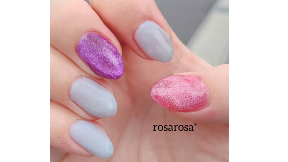 自分のネイルを変えました。 右手です。 右手は、利き手ではない左でやるので、シンプルなデザインが多いです。 くすみブルーと、マグネットネイル2色です。 マグネットは、シンプルだけど華やかで可愛いので、おすすめです(^-^)/