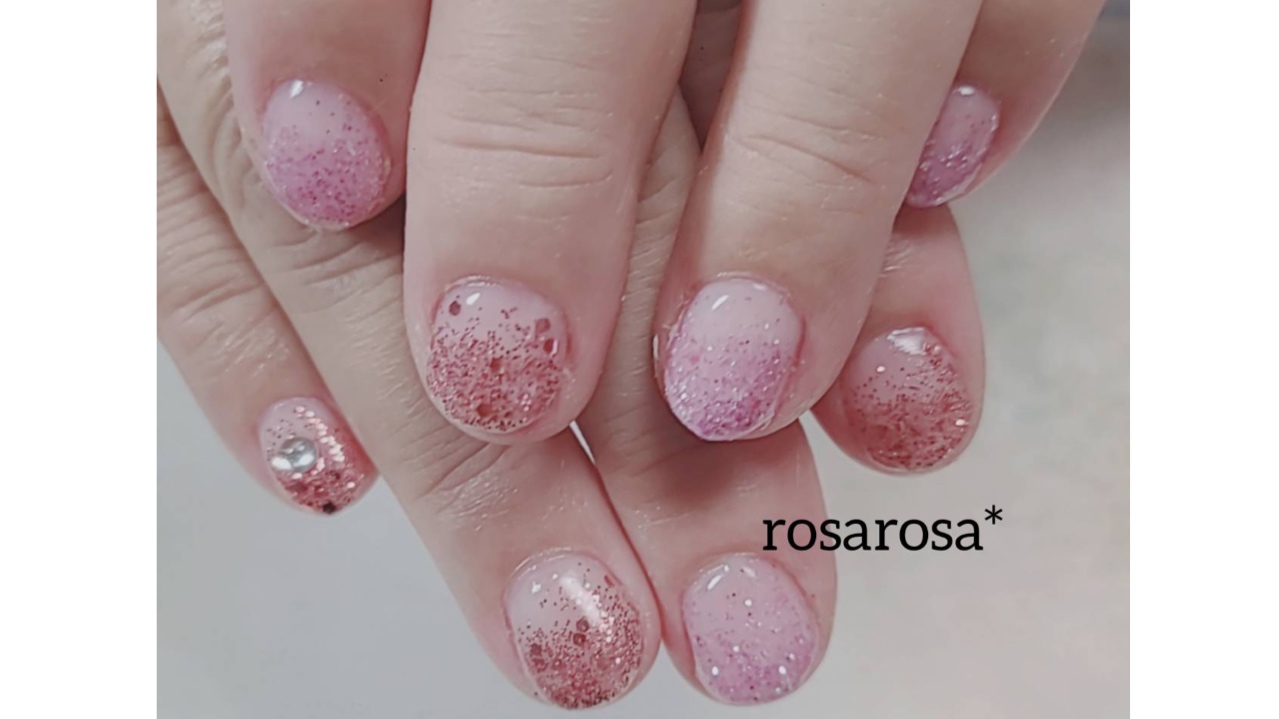 ホログラデーション 2022.06.30 ラメグラよりも、ホロが入っているので、華やかさがあります。 ピンクと薄いパープルが柔らかい印象になります。 小指にストーンのアクセントは、お仕事運UPになります!
