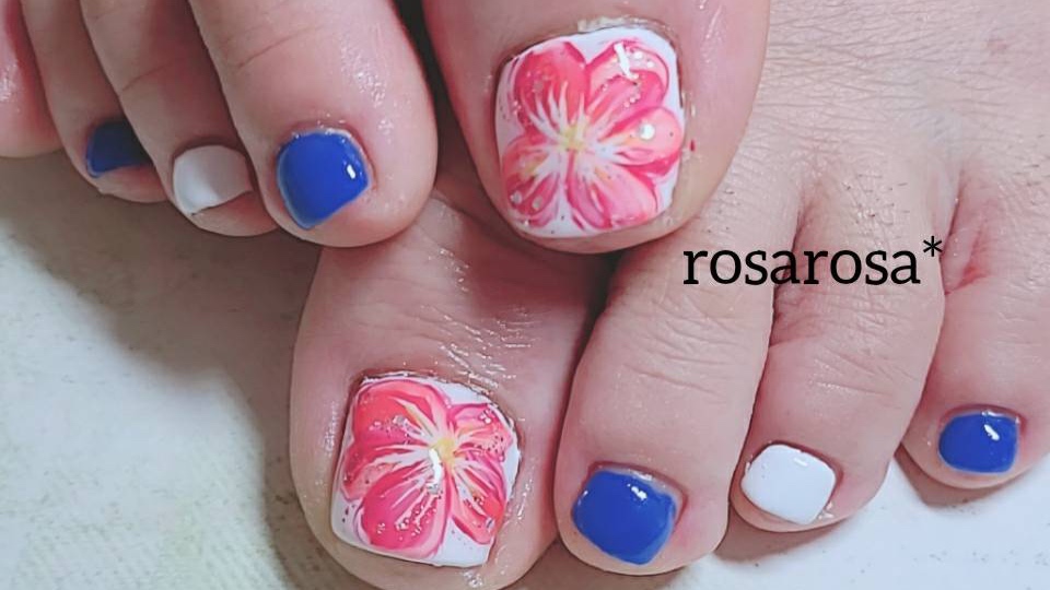 青と白のワンカラーに、親指にはお花のアートを描きました。 とっても涼しげな組み合わせです。 ピンクのお花が映えますね(*^^*)
