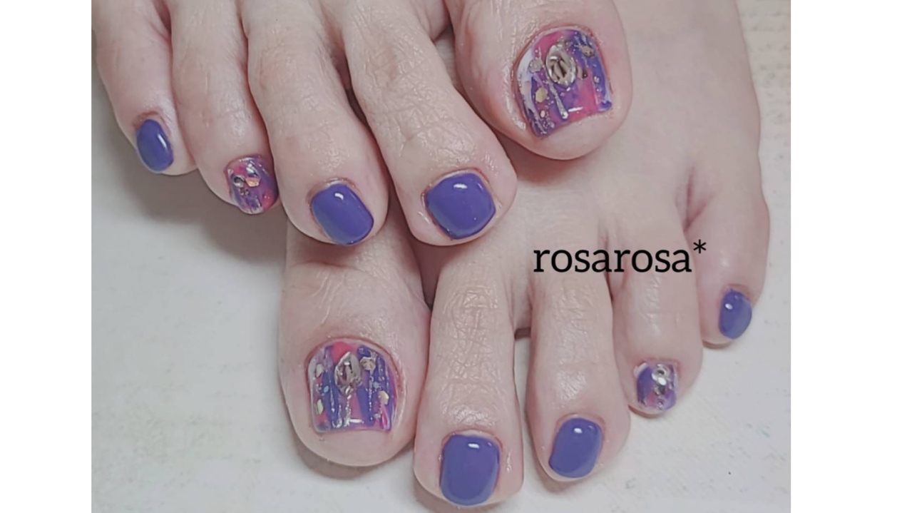 パープルのワンカラーです。 親指は、ニュアンスネイルに、大きめのストーンを乗せました。 好きな色を乗せると、テンションが上がりますd=(^o^)=b