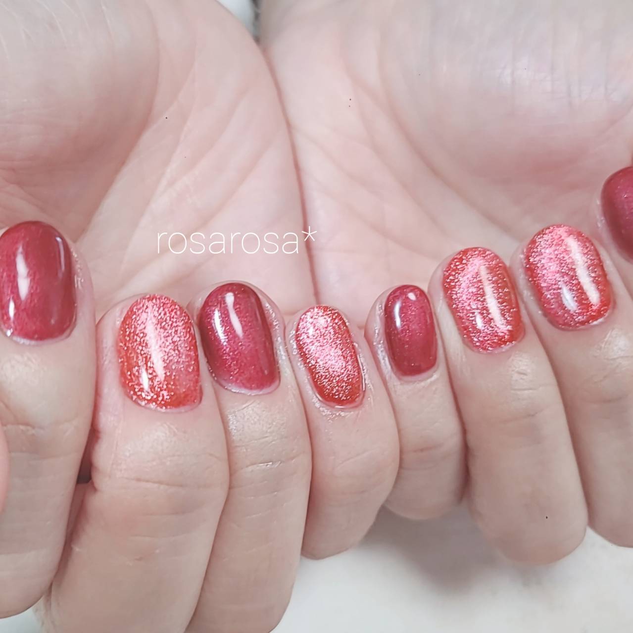 イエローベースさんにぴったりの赤のマグネットネイルです! ベースにも、黄みのある赤のワンカラーを乗せました。 肌にツヤツヤ感が増して見えますd=(^o^)=b