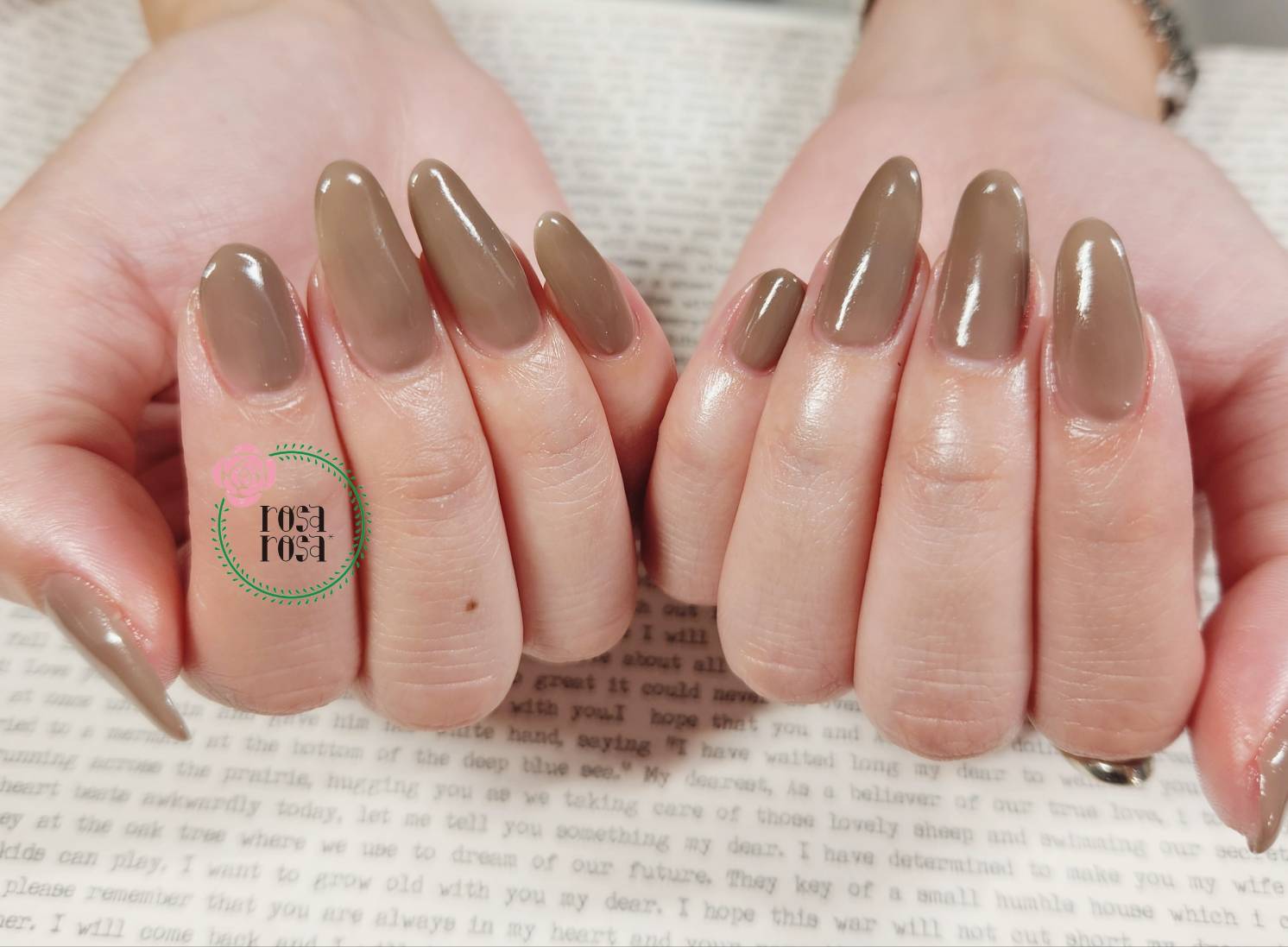 ロングネイルにモカ色、格好いいです! こういう色を、夏にやると重たく感じますが、涼しさを感じるようになってくると、不思議としっくりきます。 季節感って、大事ですね。