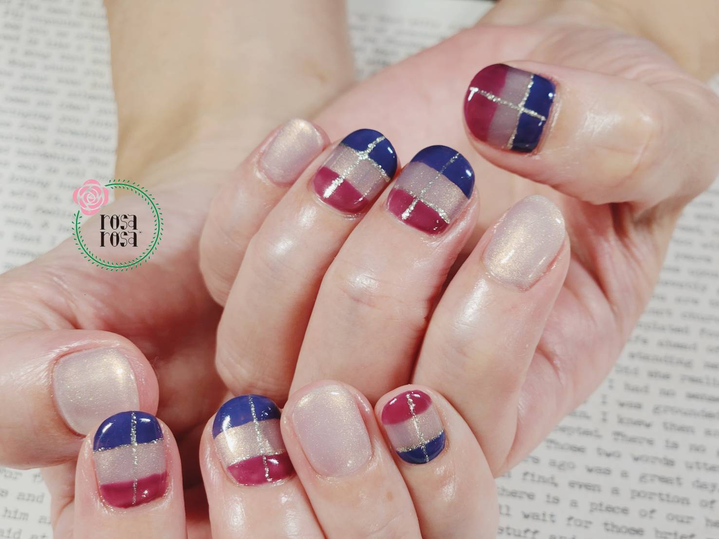 新色③ 2023.11.5 ブルーベースのお客様なので、ブルーベースで、統一したデザインです。 パール感のあるパープルが新色です! 淡い色が、お肌を白く綺麗に見せてくれています。 3色のトリコロールは、分断感を目立たなくするために、薄いクリアのパープルを重ねました。 ちょっぴり濁ったので、まとまりがよくなりました(*^^*)