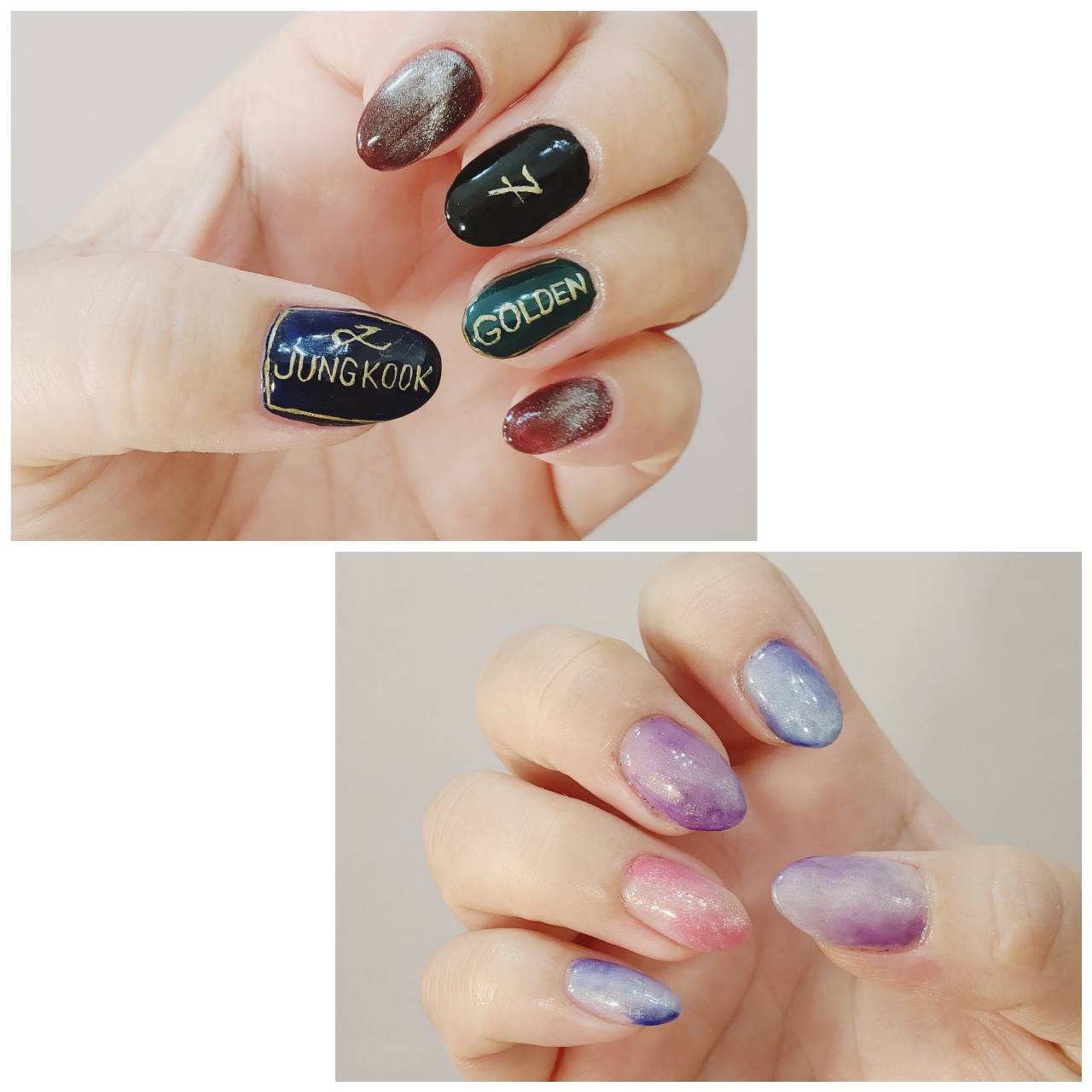 myネイル 2023.11.9 先日、推しがソロアルバムを発売しました。 左手は、先月からそのネイル。 文字が上手に書けて、テンション上がります! 色は、イエローベースの色なので、私は苦手な色ですが、推し愛勝ちました! 右手は、新色を使ったニュアンス。 パール感のあるパープル、ピンク、水色が新色です。 手元が華やかになりますd=(^o^)=b