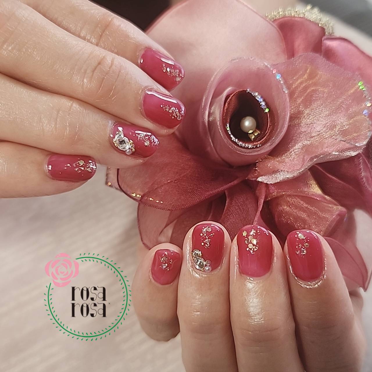 セレモニーネイル 2025.03.14 入学式に使われるコサージュをイメージして、ネイルの色、デザインを決めました。 紫みのあるピンク、オーロラホロでキラキラ、ストーン、パールも乗せて豪華だけど上品にまとまりました。 小物に統一感があると上品で優雅な印象になります! セレモニーがある方、コサージュをお持ちになって、是非いらしてください。